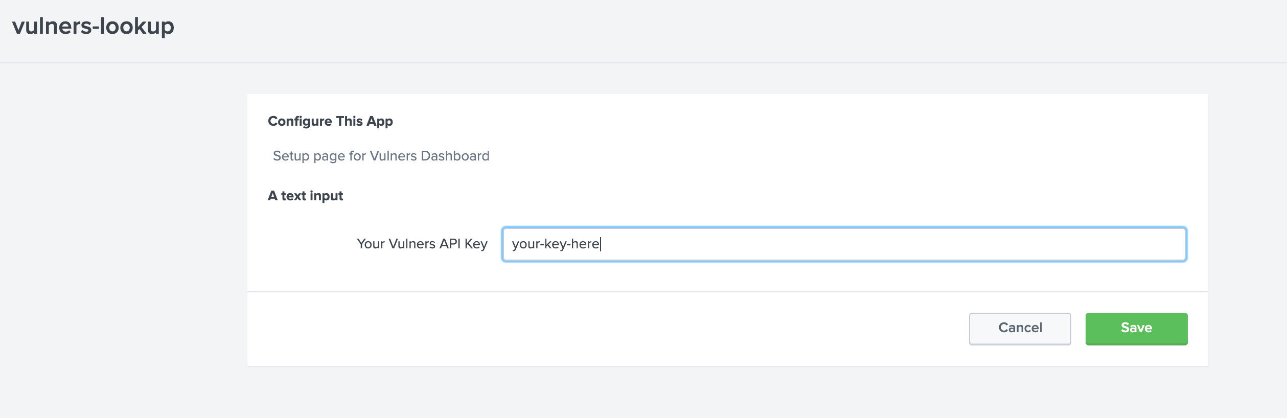 Apps -> Install app from file -> choose [vulners-lookup-*.tar.gz](https://github.com/vulnersCom/splunk-vulners/blob/master/result/vulners-lookup-0.0.3.tar.gz)